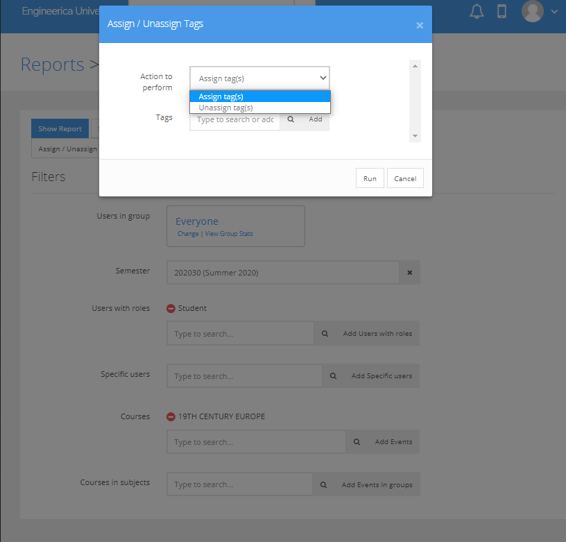 2. Select the filters that will group the users to be tagged/untagged. In this example below, we have used the Semester filter set to "202030 (Summer 2020)", the Users with Roles filter set to "Student" and the Courses filter set to "19TH CENTURY EUROPE".