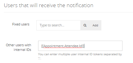 To send an automatic notification, click Add Action. Choose Send Notification, then select a Notification topic created in the previous step. Make sure to use the token [[Appointment.Attendee.Id]] in the field, "Other users with internal IDs." This specifies all Users who were going to attend the appointment.
