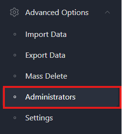 2. To create, edit, or delete an administrator, go to the Advanced Options section and click Administrators.