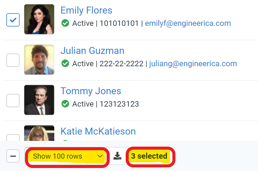 TIP: You can increase the page size to show more users per page as well as see how many users are currently selected at the bottom of the list.