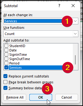 5. Select "Services" under "At each change in," then enable "Services," "Replace current subtotals" and "Summary below data" before clicking OK.