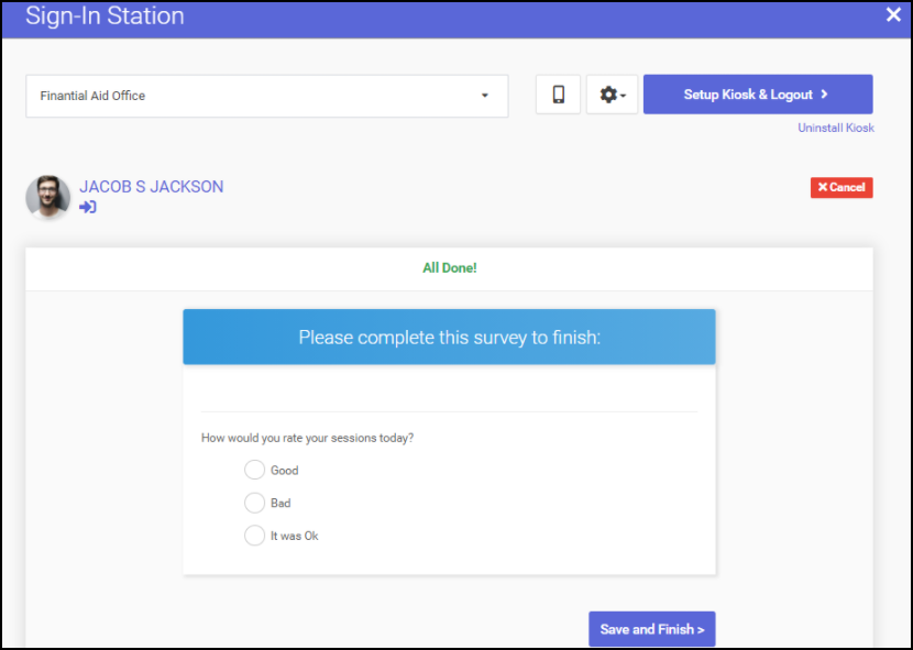 When a user signs out of a Kiosk, a survey may sometimes appear. To complete these surveys, simply answer the questions, then click Save and Finish >.