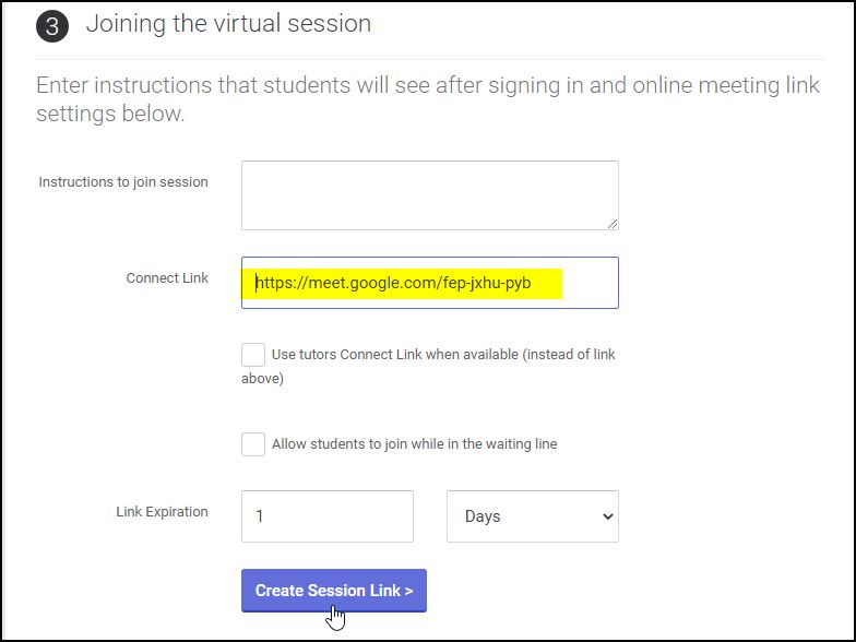 Now, all students will use this Google Meet link to meet with this specific tutor online.