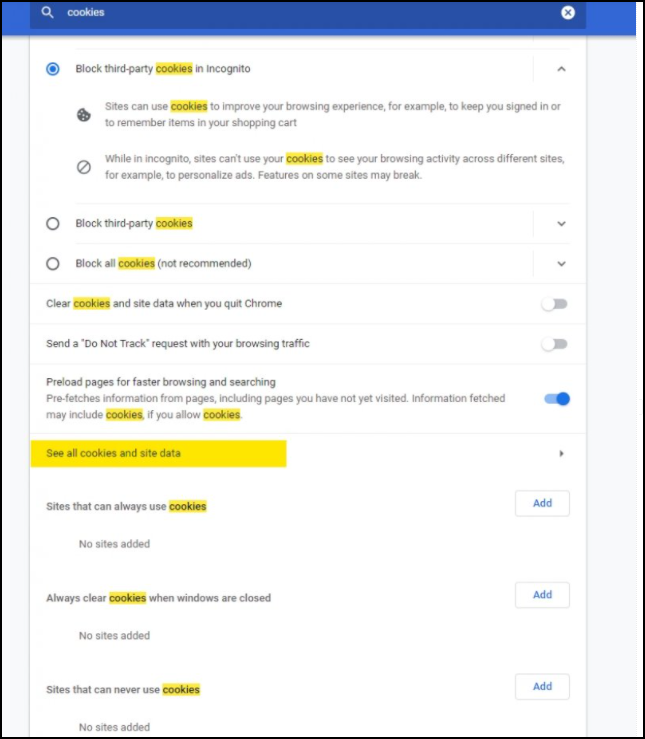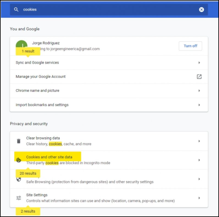 2. Search for “cookies” in the settings (Google Chrome displayed):