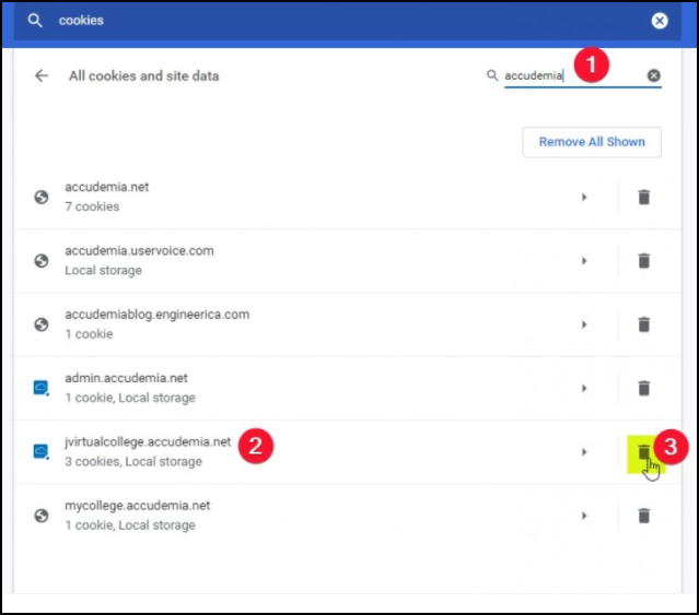 Firstly, make sure to delete ONLY the cookies related to your Accudemia system; you should not delete ALL cookies, as Accudemia's database information will not be affected. This is only to delete the temporary “preferences” information saved by the web browser. If you do not feel comfortable doing this, contact your I.T staff for help.