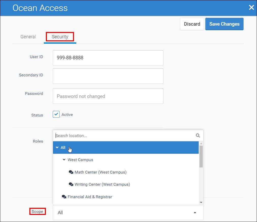 3. Select the "Security" tab, then choose which Center to restrict the user to by using the "Scope" dropdown menu.
