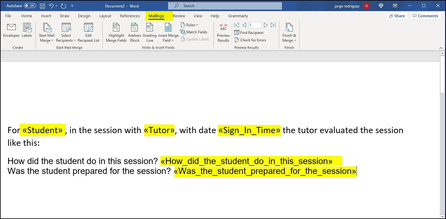Accudemia: How do I send individual tutoring assessments to students using MS Word Mail Merge?