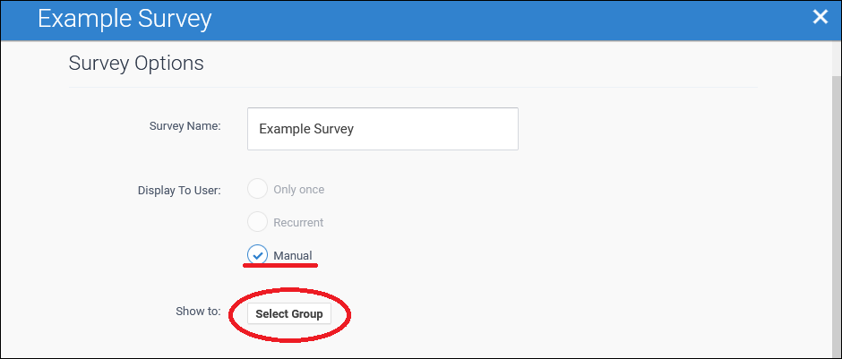 4. Select "Manual" beside "Display to user," then click the Select Group button.