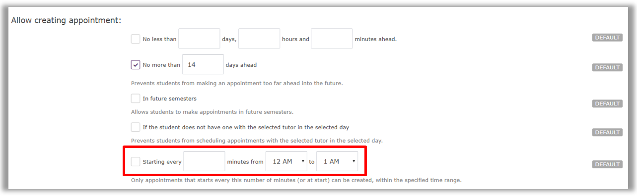 6. Scroll down to Allow Creating Appointment. Set the specific times during which appointments will be offered.