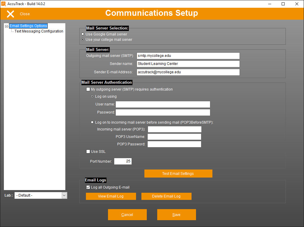 There can be several reasons that you may need to check with your IT/Network Support Team onsite as to why the mail server is not sending the emails out from AccuTrack/AccuSQL so this guide is for those that have exhausted those possibilities. Of course you need to have the communication setup done in your AccuTrack/AccuSQL software for each Local Lab/Center that you have in the system. Here is a quick guide on how to setup those settings: