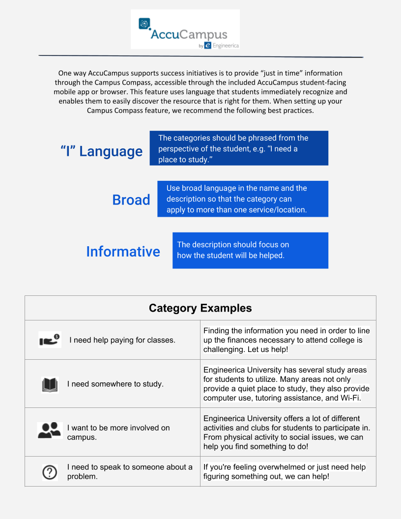 Module 7: Campus Compass in AccuCampus Topic: Campus Compass Advanced Options > Campus Compass Settings Services Service Availability Compass Categories Campus Compass (Student View) Campus Compass One way that AccuCampus supports success initiatives ...