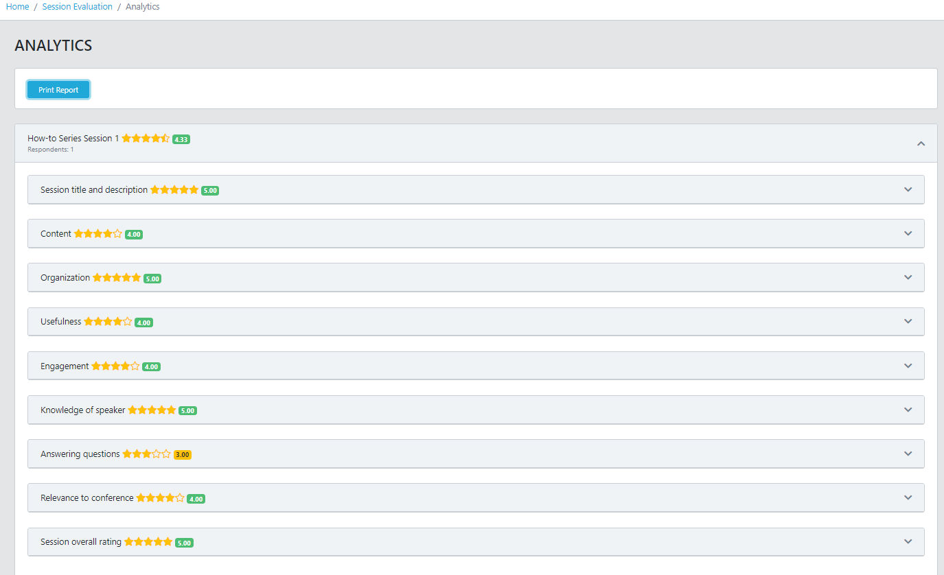 This option lets you view evaluations for each session. After selecting a session, you’ll see a list of responses grouped by attendee. Any comments submitted will also be displayed. Click Print Report to get a hard copy of the information.