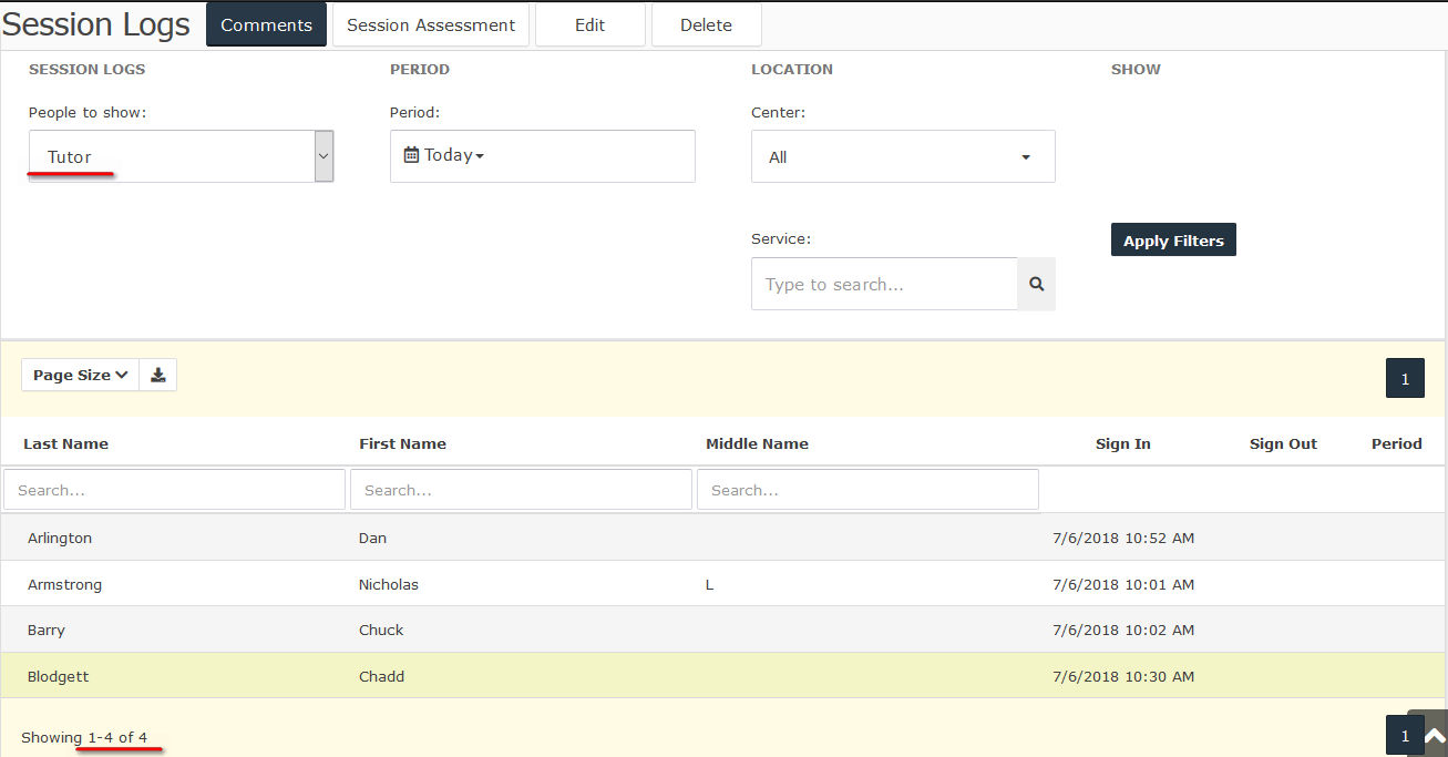 The results after 5 minutes... the Tutor and the Student/Tutor are still signed-in. It should be noted this is a screenshot from the Session Logs being filtered on Tutor Sign-ins. Only Tutors and Students can sign-in to Accudemia and each is stored in a separate log.