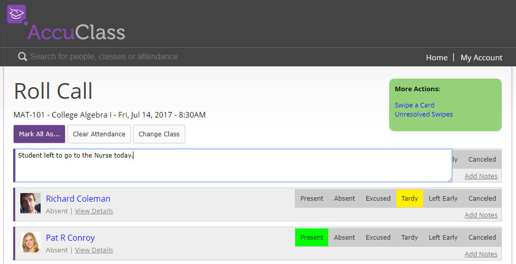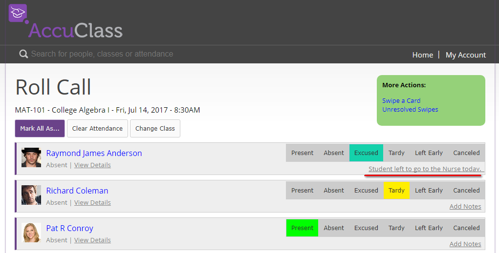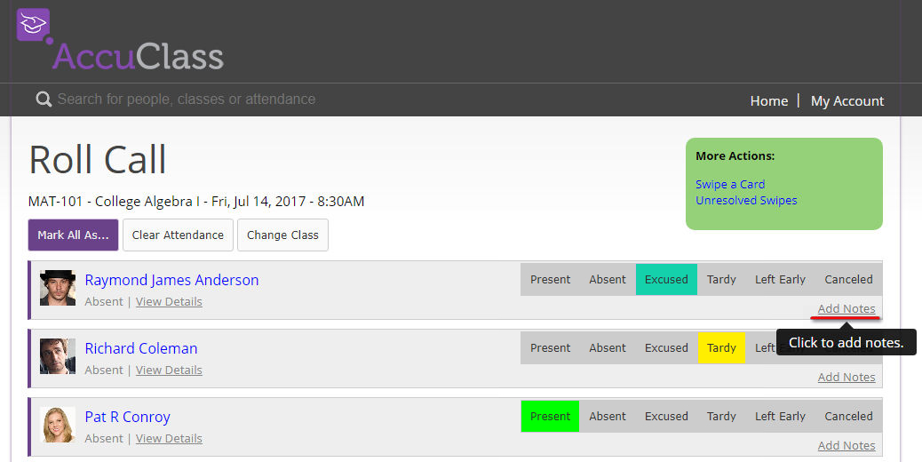 - On this Roll Call screen if you want to add a note to a Student that swiped out during the class session click the Add Notes link on the end of their record as shown below:
