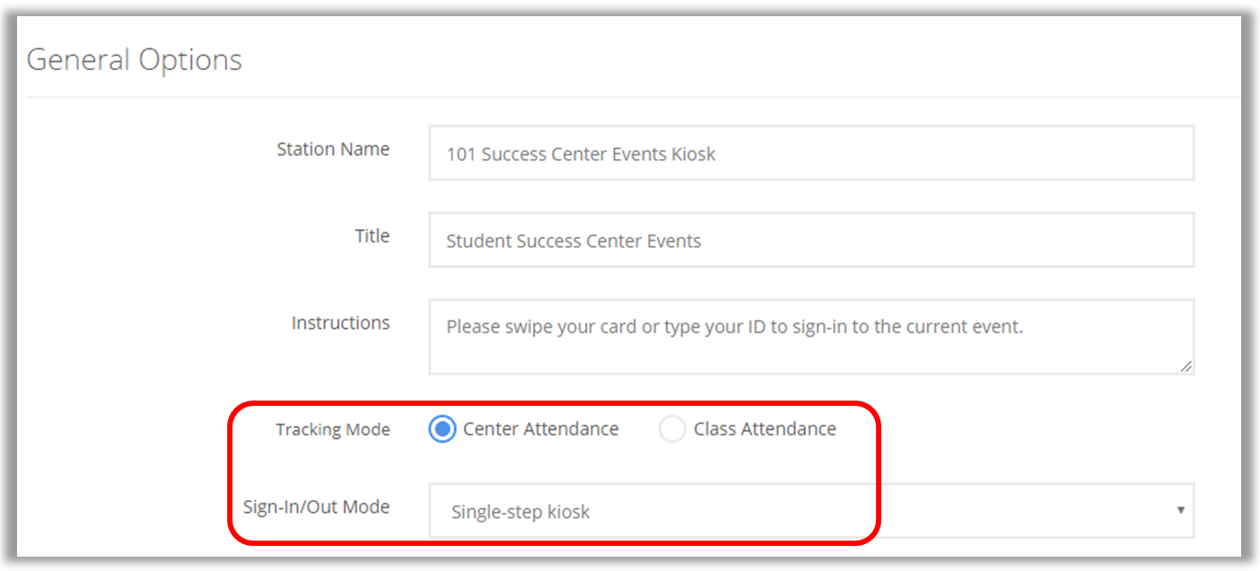 4. Ensure that the sign-in station has a tracking mode of Center Attendance and a sign-in/out mode of Single Step Kiosk.