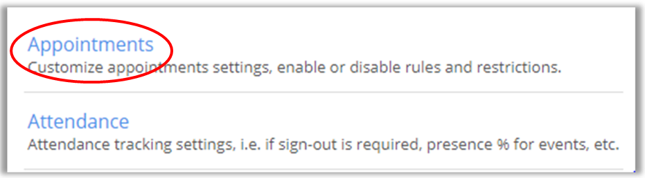 This article will explain how to adjust all of the settings for appointments. If you know which specific setting you want to change, go to that article instead. 1. Log into Accucampus. From the Main Sidebar hover over the Advanced Options category. ...