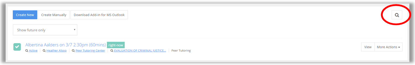 3. By default, you'll be shown all upcoming scheduled appointments. To search for a specific appointment, click the look-up glass on the right hand side of the screen.