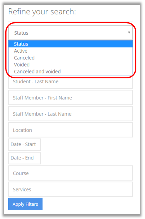 5. Status: this allows you to filter by whether an appointment was fulfilled or not. Active indicates appointments that either have not yet occurred or that were successfully completed.