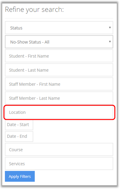 12. Service: allows you to narrow down the search further with the service the appointment was for. Note that if you are using a location filter, the service must match a service available at that location.
