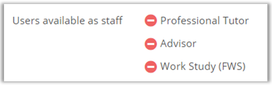 8. Roles mapped as, Users available as staff will be selectable from the drop-down menu in the Sign-in Station settings, which allows them to be selected by attendees during sign in/out, or to sign in themselves for their work hours. Users with this role will also have a new option added to their profile to edit their availability schedule and available courses and services, though they will not be able to control their own availability without appropriate permissions.