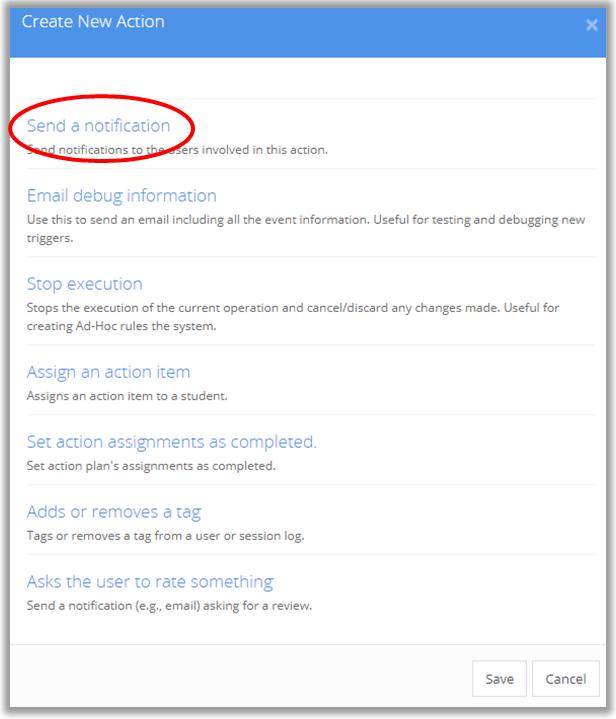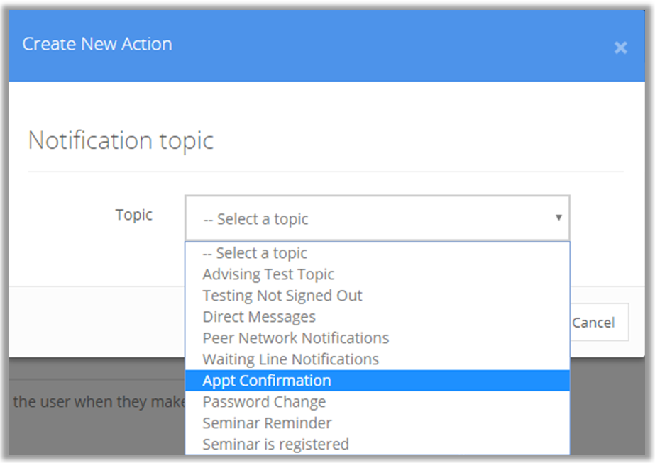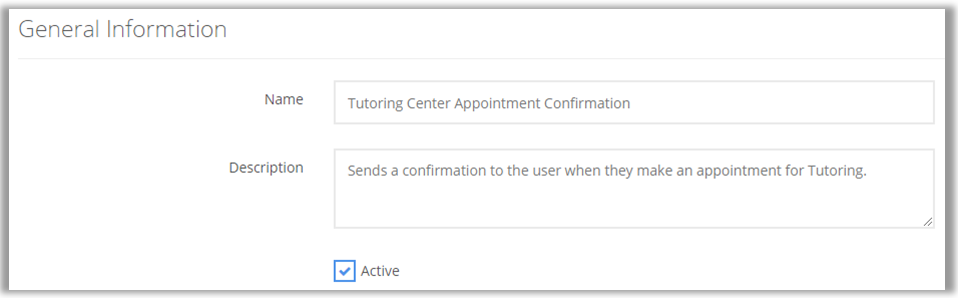 NOTE: More than one action can be applied by clicking either the And or the Or buttons once the first action is created. This can be used to create additional actions for the same user or a separate action for a separate user. An example would be one action that sends a confirmation to the student when an appointment is made, and another action that sends a separate notification to the staff member with whom the appointment is scheduled.
