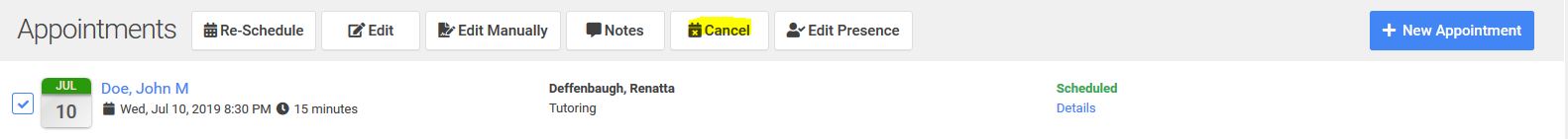 1. On the Main Sidebar, hover over Appointments. 2. Click View All. 3. Search for the appointment you wish to cancel by either scrolling through the list of appointments, or using the look-up glass in the right hand corner. 4. Once the appointment ...