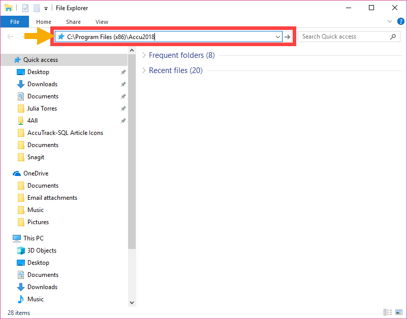 Step 2: Navigate to the file location for AccuTrack. You can use the address bar and type in the path. The default path for AccuTrack 2018 is: “C:\Program Files (x86)\Accu2018”
