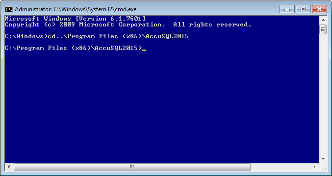 2. In  the cmd window navigate to the folder where AccuSQL2015 is installed  (default is either C:\Program Files (x86)\AccuSQL2015 for 64-bit or drop  the (x86) if 32-bit.