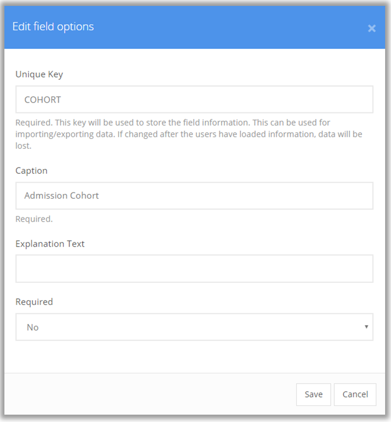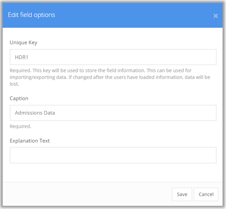 A dialog box will appear. Enter a Unique Key and a Caption (this will be the section header.) Remember to make the Unique Key and the Caption specific and descriptive so that others will understand them. The Explanation Text is not required, but can be helpful to further explain the header. NOTE: The Unique Key is also used for importing/exporting data and for the Risk Score Model (if used) so make it understandable and memorable. If changes are made to the Unique Key after information has been imported, data will be lost.