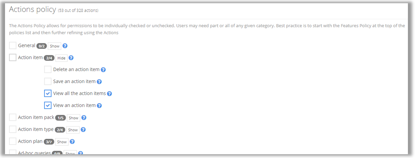 Actions Policy: this feature allows administrators to assign individual permissions to a role. It is meant as a way to refine the Features Policy.