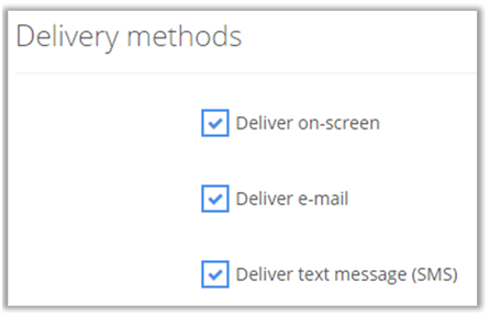 Choose Delivery Methods. You can choose to deliver via On-screen Notification, E-mail or Text Message. We recommend sending the notification via all channels so that users are more likely to receive it.