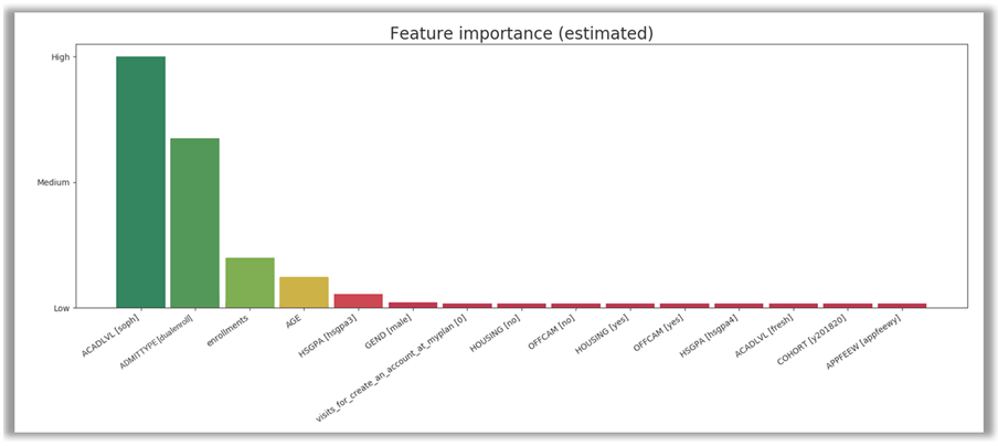 After creating the risk model, but before processing it, view the analysis of the model. This screen will show each feature that was included in the model as a graph with a visual breakdown of the student population for that factor. These graphs can be used to 1) identify any issues with the data that might have been missed prior to importing and 2) help the user determine if the model should be adjusted before processing. There is also a graph showing what the system believes are the most important features based on the data. Again, this graph allows the model to be tweaked based on the user’s knowledge of the institution. Tweaking the model would include excluding features or creating new combinations of features to include. Once satisfied, the user can then run the model by clicking Process. This will start the machine learning system.