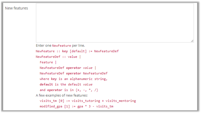 Once you click Save and Analyze, the system will begin analyzing the data that will be included in your model to come up with the best algorithmic model to use. The Analysis screen will show you each feature that was included in the model as a graph with a visual breakdown of the student population for that factor as well as a graph that shows you the weighting that the system has applied for each feature. These graphs can be used to 1) identify any issues with the data that might have been missed prior to importing and 2) help you determine if the model should be adjusted before processing. Tweaking the model would include excluding features or creating new combinations of features to include. Once satisfied, you can then run the model by clicking Process. This will start the machine learning system.
