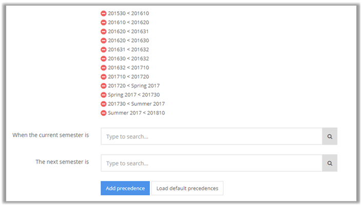 Add semester precedences. These tell the system how semesters proceed from one to the next. We recommend including at least Spring and Fall semesters, but you can include all semesters if desired. Keep in mind that not all students will proceed through the semesters the same.