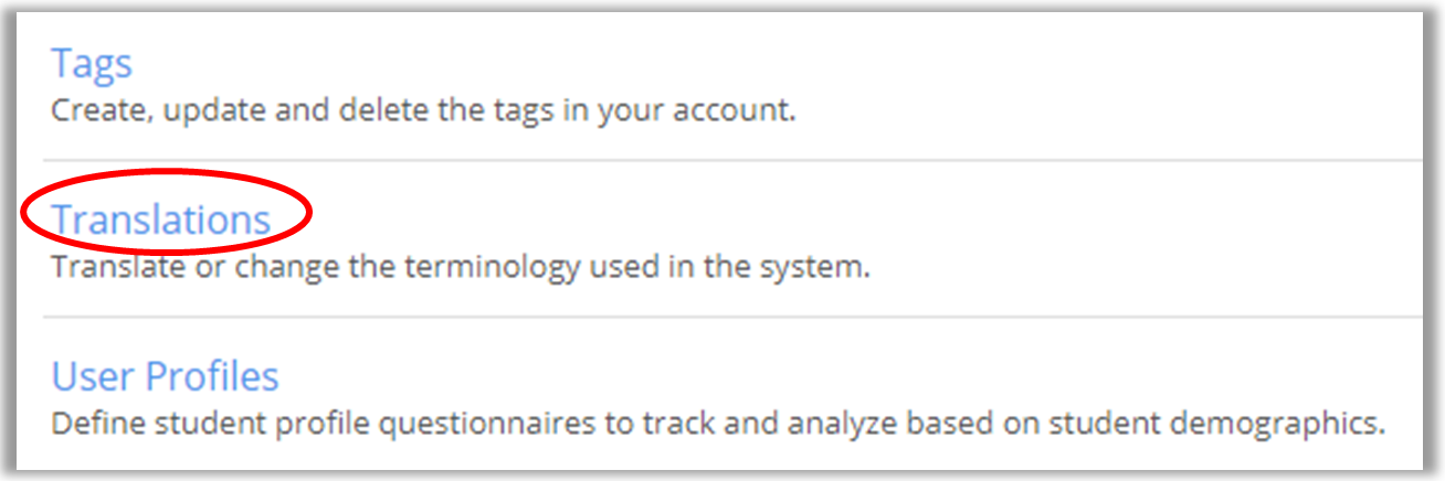 Within this page, you are able to enter translations of common terms or change the terminology to match your institution’s terminology within the AccuCampus system. This change will be for your entire domain.