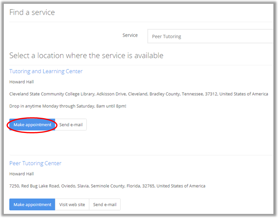 Click Make Appointment. Note: you may also Send E-mail to or Visit Website of the location to discuss your concerns or to set up an appointment (if directed to do so)