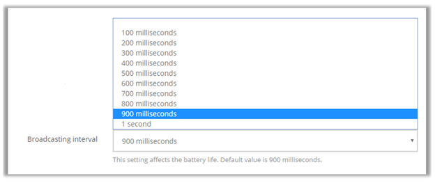 Broadcasting Interval: the default value is 900 milliseconds. Changing this can affect battery life.