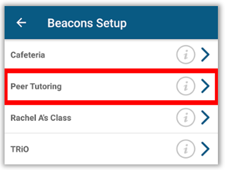 Once Beacon setup has been accessed a list of nearby beacons will appear. Note: If no beacons appear, open the back of the beacon and make sure it is turned on – the blue light should be sustained and not blinking when you press the button.