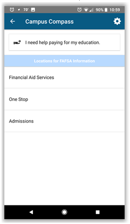 One way that AccuCampus supports success initiatives is to provide “just in time” information through the Campus Compass, accessible through the included AccuCampus student-facing mobile app or though the website. This feature uses language that students immediately recognize and enables them to easily discover the resource that is right for them.