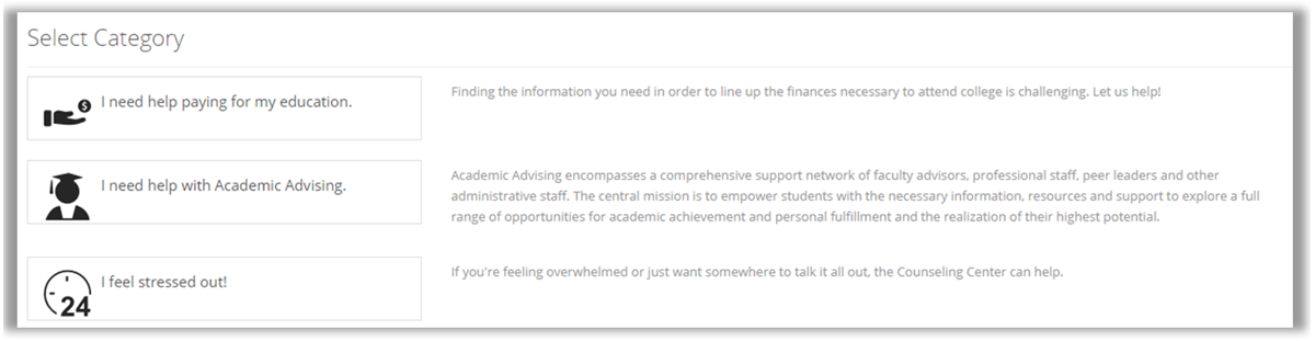 This is the main feature to set up your Campus Compass. Each category will be associated with services, which will then funnel students to the specific location they need in order to access the specific resource they need. Not all services need to be included in the Campus Compass. We recommend being thoughtful when deciding which categories and thus which services should be used. All categories should use broad language in order to act as the top of the funnel.