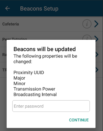 password and tap continue. A message will appear at the top confirming that the beacon was